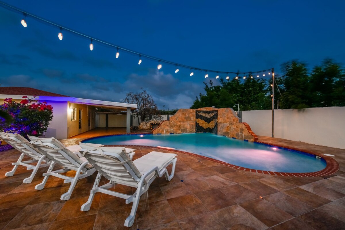 Sviitti, jossa on keittiö, uima-allas ja näkymä meren laskuun