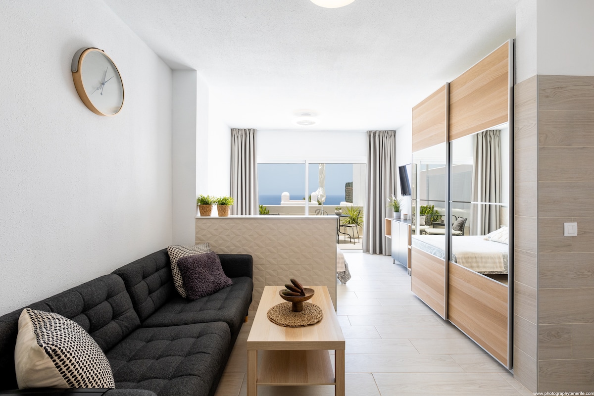 Kaunis studio Playa Paraísossa, josta on upea merinäköala La Gomeran saarelle. Täysin varustettu ja uudistettu. Uima-allas ja pääsy rannalle. Paljon baareja, ravintoloita ja supermarketteja. Uusi Hard Rock Hotel aivan edessä. HUOMIO: Uima-allas on SULJETTU kunnostustöiden vuoksi 16.6.2025 alkaen vuoden loppuun asti.