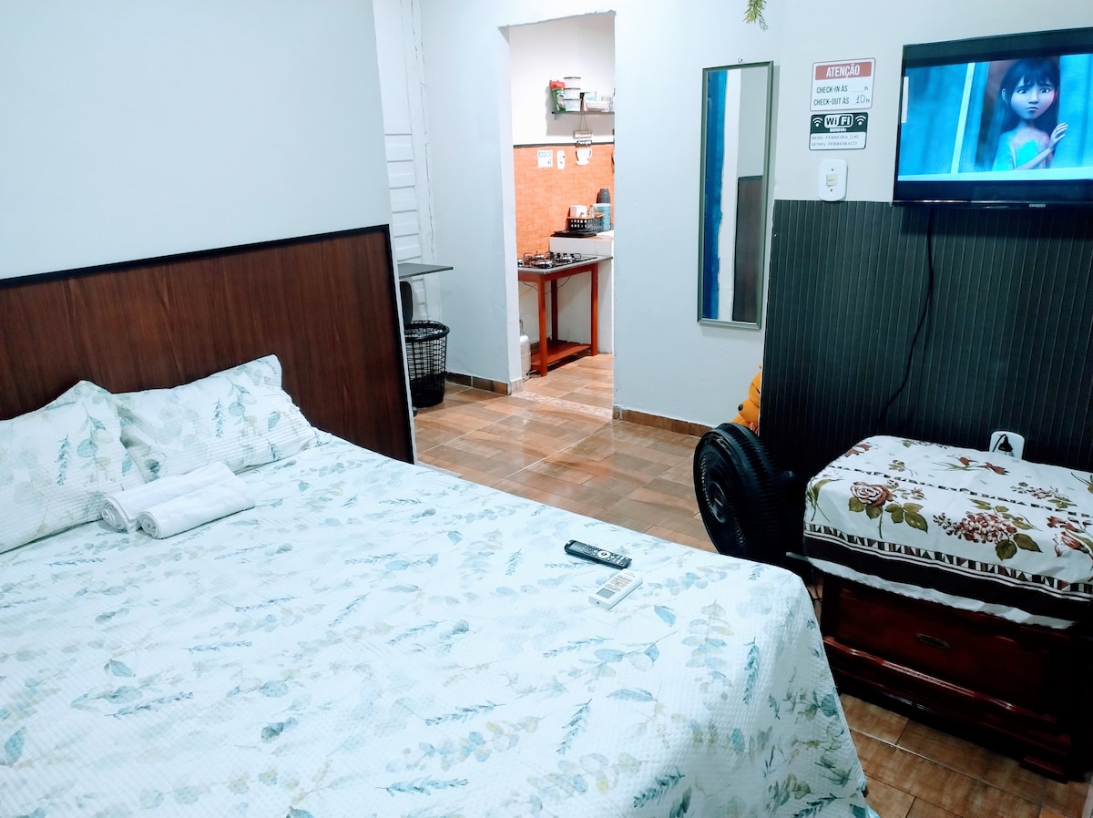 Acomodação confortável para até 5 pessoas, prática e muito bem localizada você estará a poucos minutos do centro, aeroporto e cercado por padarias, restaurantes, farmácias, sorveterias e muito mais O ambiente é completo e equipado para te receber com conforto: 🛏️ Cama aconchegante 📶 Wi-Fi de alta velocidade 🫧Máquina de lavar ❄️ Ar-condicionado ☕ Cozinha com utensílios 🧺 Toalhas e roupa de cama 🧼 Ferro de passar disponível Tudo pensado para que você se sinta em casa