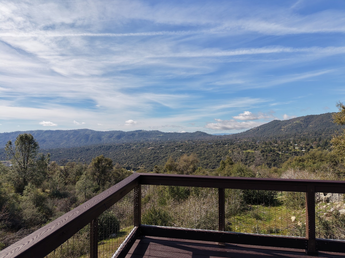 Kuvittele vuoristomökki, jossa on yksityinen mökki vuorella kaukana kaikesta, upotettuna näkymiin, puihin, luontoon, samalla kun se on 5 minuutin päässä kaupungista, kaupoista, 17 mailin päässä Yosemiten sisäänkäynnistä. Upeat näkymät Sierra Nevadan vuorille terassilta ja mökistä, jossa on seinästä seinään ulottuvat ikkunat, jotka kutsuvat näkymän sisään. Koe auringonnousut, auringonlaskut, luonto, tähtien tarkkailu, tulipalot. Mökki tarjoaa ainutlaatuisen elämyksen! Rentoudu, palauta ja nauti näkymistä tässä rauhallisessa, romanttisessa ja rauhallisessa ympäristössä.
