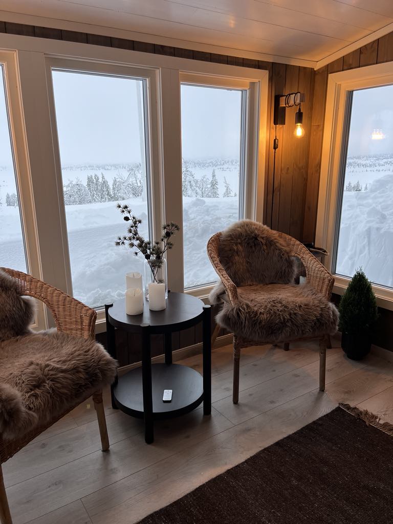 Mökki nimeltään Vesla. Sijaitsee keskeisellä paikalla Sjusjøenillä.