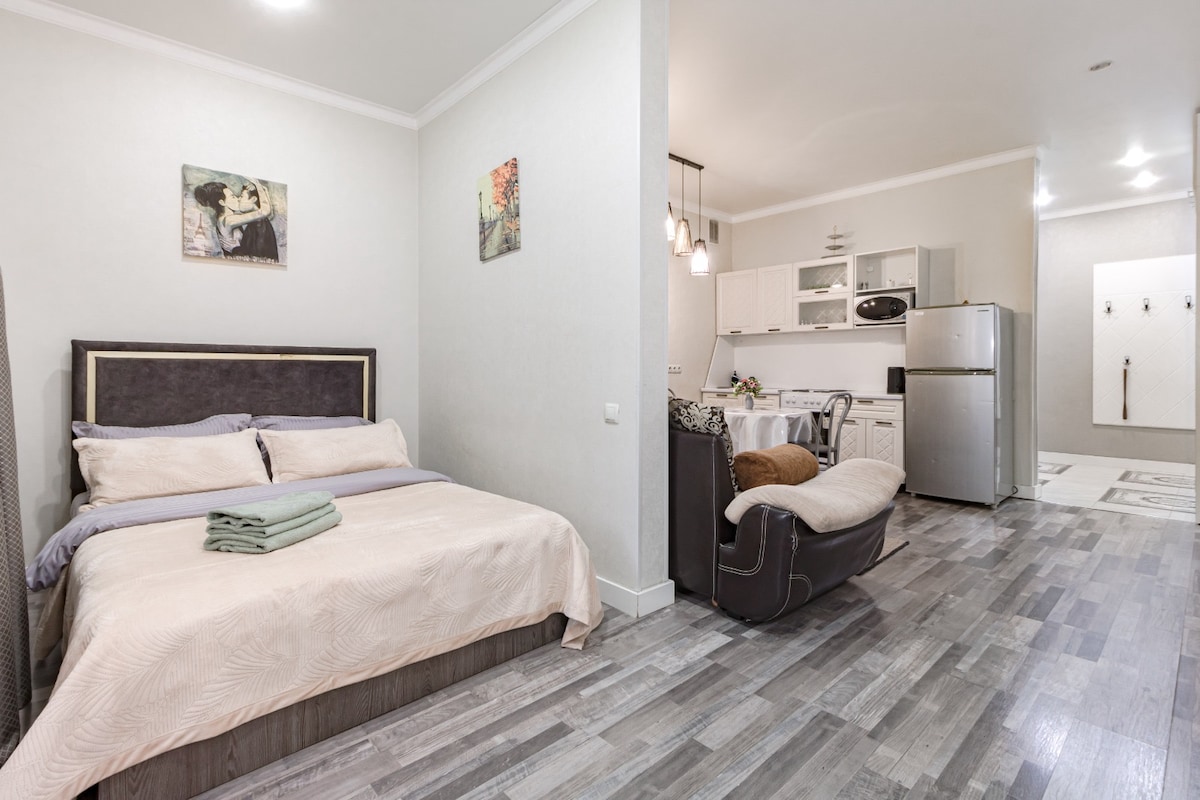 Viihtyisä huoneisto, jossa on uudet laadukkaat korjaukset ja tyylikäs muotoilu, sijaitsee kaupungin sydämessä. Kaunis näköala kaupunkiin. Talossa, jossa huoneisto sijaitsee, on Remix-myymälä. Huoneiston omistaja on yhteydessä 24 tuntia vuorokaudessa. Huoneisto on täysin puhdas. Laadukkaat vuodevaatteet ja pyyhkeet (käsille, kasvoille ja jaloille). Huoneistossa on myös kertakäyttöiset tohvelit, hammassetit, nopea internet ja Smart TV, suurella laadukkaalla TV: llä. Puhdistus on päivittäistä ja laadukasta.