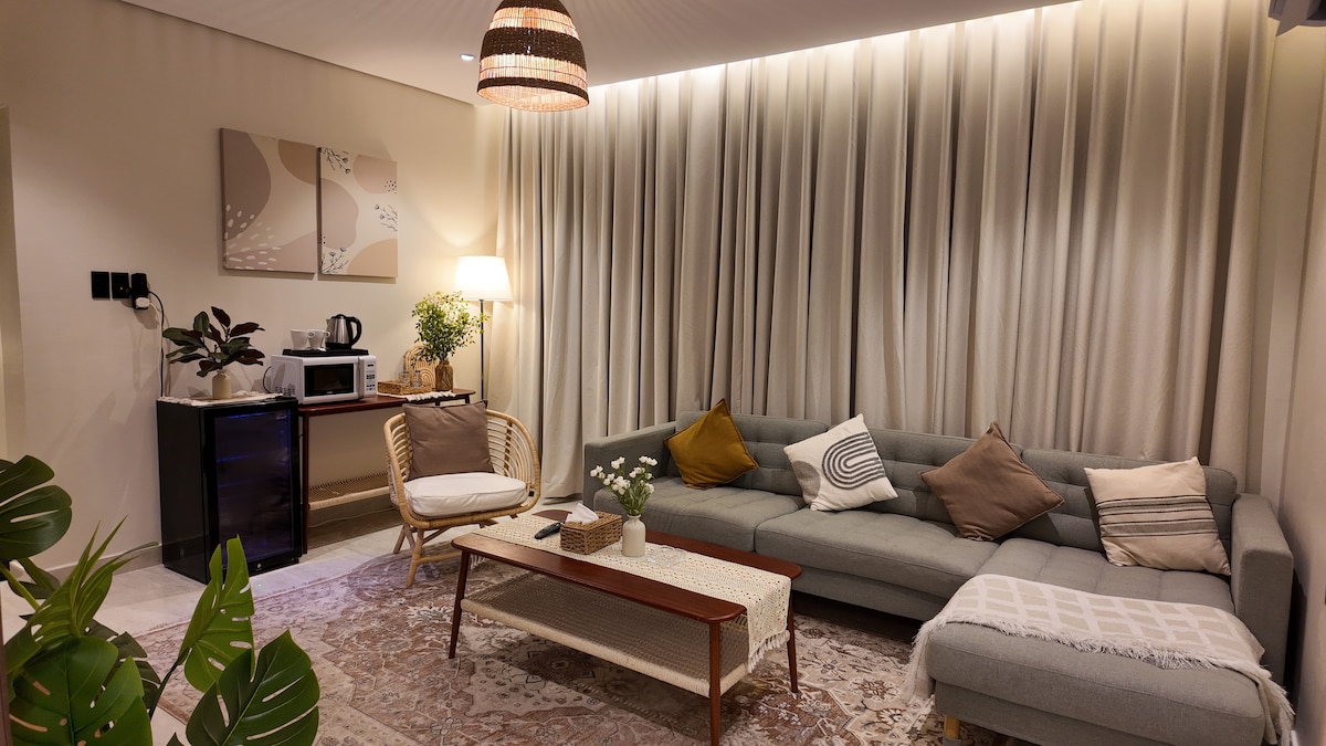 Suuri yksiö, jossa on tyylikäs suunnittelu ja ylellisiä yksityiskohtia Siellä on mukava vuode, älytelevisio, nopea internet ja oma poreallas. Hotellin tyylinen kylpyhuone Olaya Al Khabarin naapurustossa, lähellä kahviloita, ravintoloita ja palveluita Itsenäinen osallistuminen hiljaiseen ja viihtyisään kokemukseen.