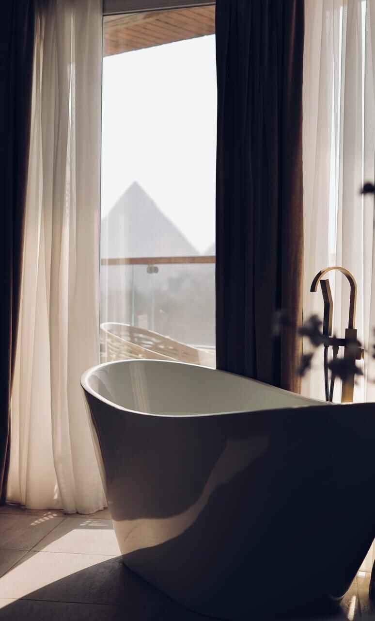 yhden hengen huone, josta on upea näkymä Gizan suuriin pyramideihin