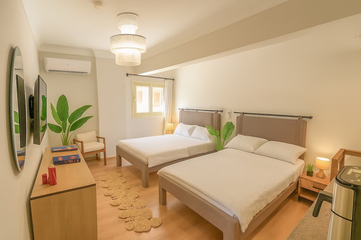 Teemalla varustetut minimalistiset design-huoneet, joissa on patio ja pääsy uima-altaalle, suunniteltu ja täysin kalustettu täyttämään yhden tarpeen. Ainutlaatuinen sijainti, josta on selkeät reitit ja helppo pääsy seuraaviin: – Paikalliset markkinat (5 minuutin kävelymatka) - Bussiasema (5 minuutin kävelymatka) - Keskusta / Kairon festivaalikaupunki "Mega mall" (10 minuutin kävelymatka) - Soudi Market ja 7 tähden paikallinen ostoskeskus (10 minuutin kävelymatka)