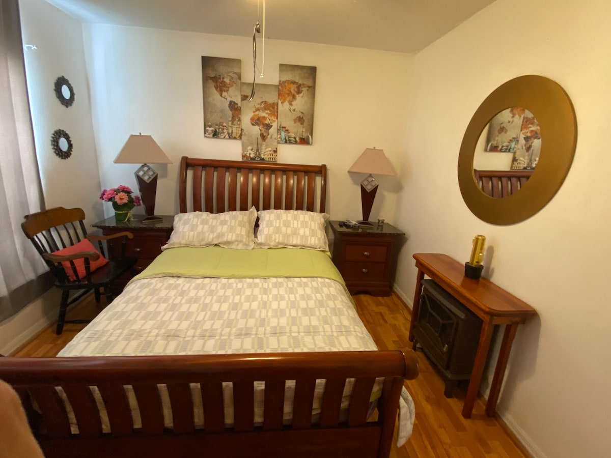 No shared areas. This apartment is located in a separate area of the house with a private entrance. It has 1 bedroom with a queen size bed, 55” smart tv, dresser, closet, and 2 nightstands. The den contains a 50” smart tv, sink, microwave, table and 2 chairs, cooktop, small refrigerator/freezer, “L” shaped sofa. The bathroom has double vanity sink, shower, tub, linen closet and body soap dispenser. Wifi, Netflix, Amazon Prime, HBO Max included. Queen air mattress available. Private back patio