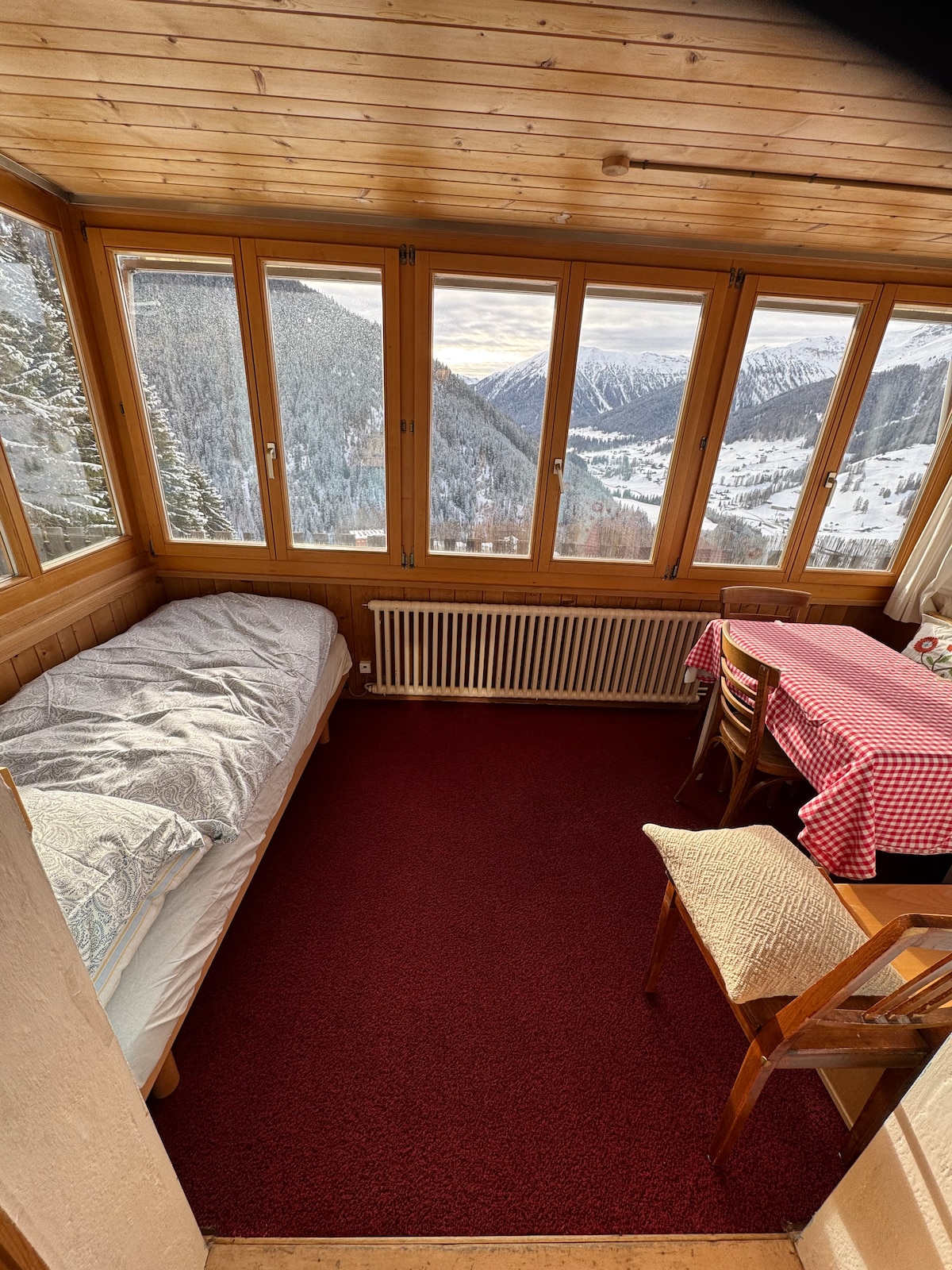Pieni ja maalaismainen minitalo sijaitsee aivan Sveitsin Alppien sydämessä. Majoituksessa on kaksi kerrosta, joissa on parivuode, suihku ja wc toisessa kerroksessa. Ensimmäisessä kerroksessa on pieni keittotila ja tilaa syödä. Sijaitsemme noin 7 minuutin ajomatkan päässä Davosista rauhallisessa ja upeassa ympäristössä. Päästäksesi Davosiin bussi pysähtyy kätevästi talomme edessä ja tuo sinut tänne säännöllisesti takaisin. Bussimaksu sisältyy vieraskortteihin.