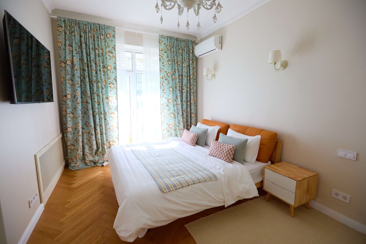 The best location to feel vibe of Almaty. The very center where everything is within walking distance! Near the shopping center, cafes, cinemas, 28 Panfilov's park, Gorky park, Zoo, Green Bazar, symphony, opera, etc. The amenities: dishwasher, washing machine, coffee machine, air conditioning, TV, 2 internet providers Kazaktelecom 500mb & AlmaTV 100mb, iron and SMART-LOCK. Towels and shower accessories are provided for all guests.