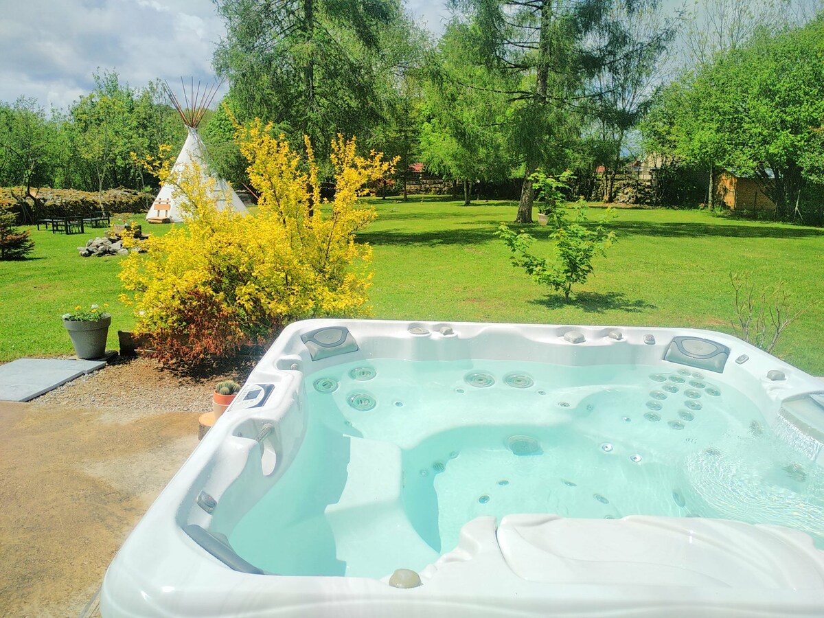 Tule majoittumaan lämmitettyyn tiipiimme, josta on upeat näkymät vuorille, luonnon hiljaisuudessa. Rakennus, joka koostuu varustellusta keittiöstä ja kylpyhuoneesta, on tiipiiden vieressä ja tarjoaa sinulle unohtumattoman laadukkaan majoituksen. Ulkotilojen oleskelutila täydentää kaiken voidakseen nauttia täysin tästä idyllisestä ympäristöstä. Lisäksi kartanomme tarjoaa ajan ulkopuolisen paikan, jossa voit latautua täysin samalla kun pysyt lähellä mukavuuksia.