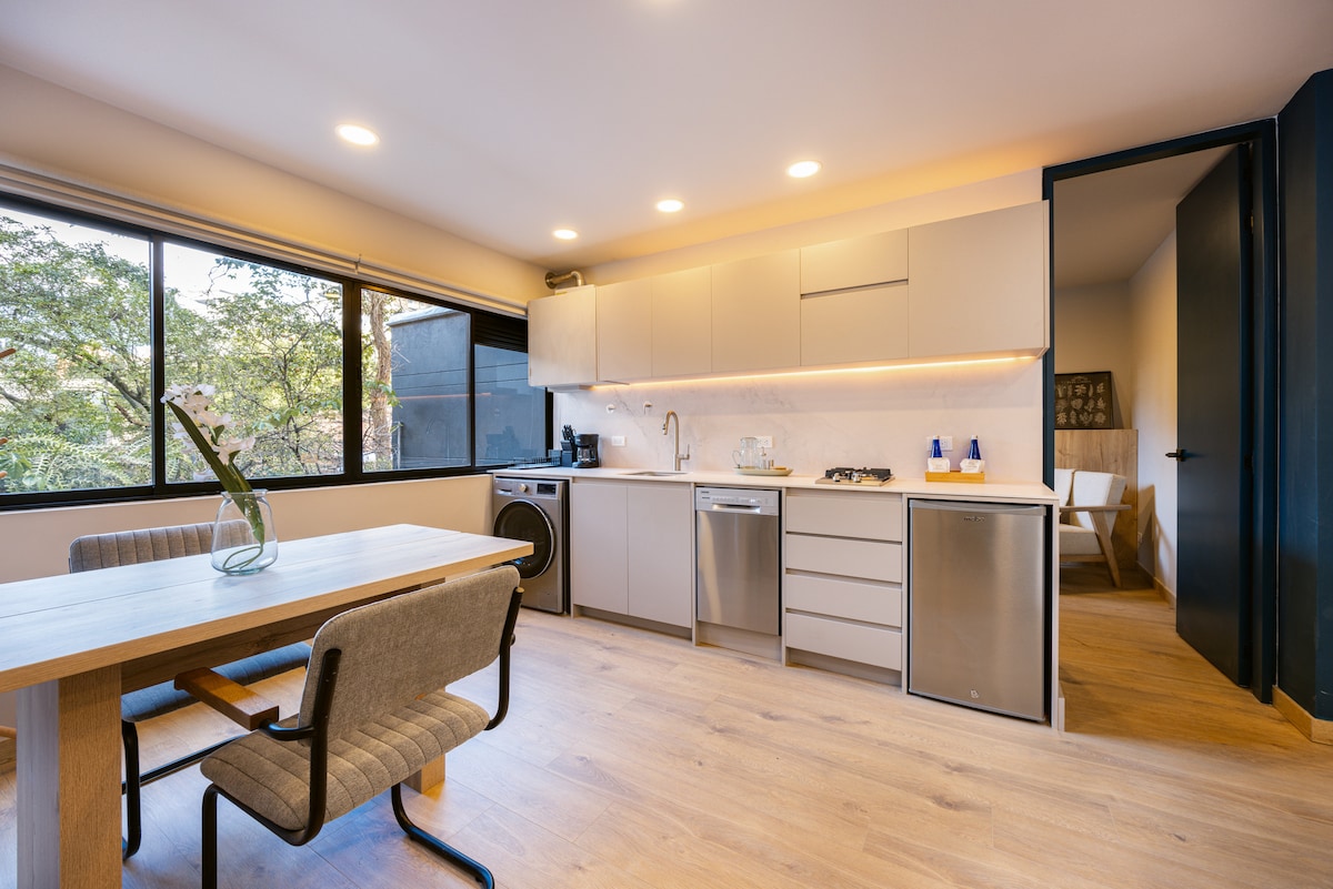 Modern top-floor studio in Laureles with mountain views and private balcony. 5-min walk to top dining & nightlife in Laureles. Features 1.5 baths, fast fiber WiFi, full kitchen, A/C, washer/dryer combo, Smart TV, with private + guest parking. Relax in a quiet, secure building with 24/7 security. Ideal for longer stays, digital nomads, and guests seeking comfort, space, and prime location. Please confirm your travel dates before booking. We prepare the apartment specifically for confirmed stays.
