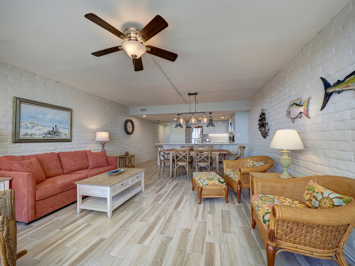 Kauniisti remontoitu, täysin varustettu 2 makuuhuoneen, 2 kylpyhuoneen rantakondominen Port Aransasissa, Texasissa, jossa on rauhallinen dyyneinäkymä takaterassilta. Kohteemme sijaitsee 7 eekkerin kiinteistöllä, jossa on paljon mukavuuksia, kuten 2 uima-allasta, pickleball-kenttä, pesutupa ja paljon muuta! **Huomaathan, että Airbnb ei peri Port Aransasin kaupungin 7%: n veroa, joka arvioidaan varauksen jälkeen ja joka on maksettava ennen sisäänkirjautumista. Port Aransasin kaupunki Lyhytaikaisen vuokraamisen lupa #217268