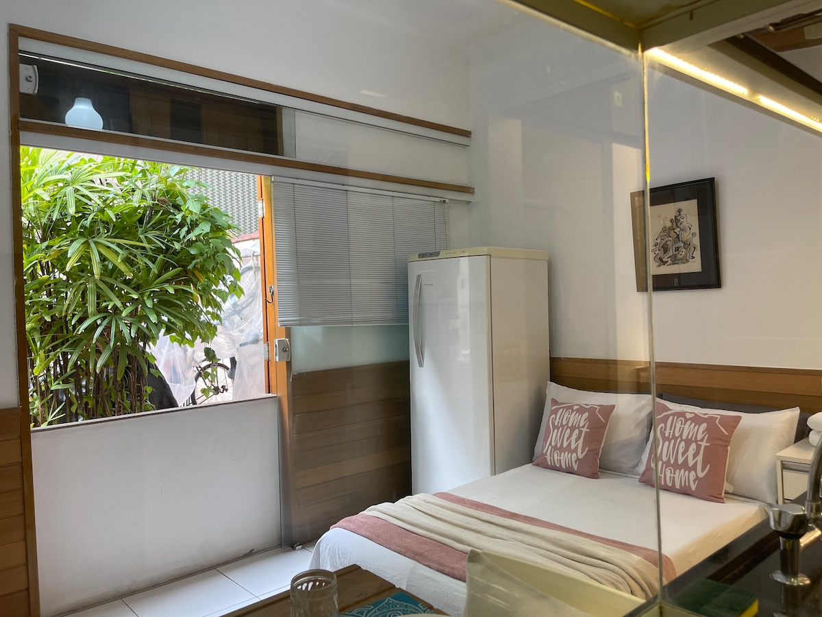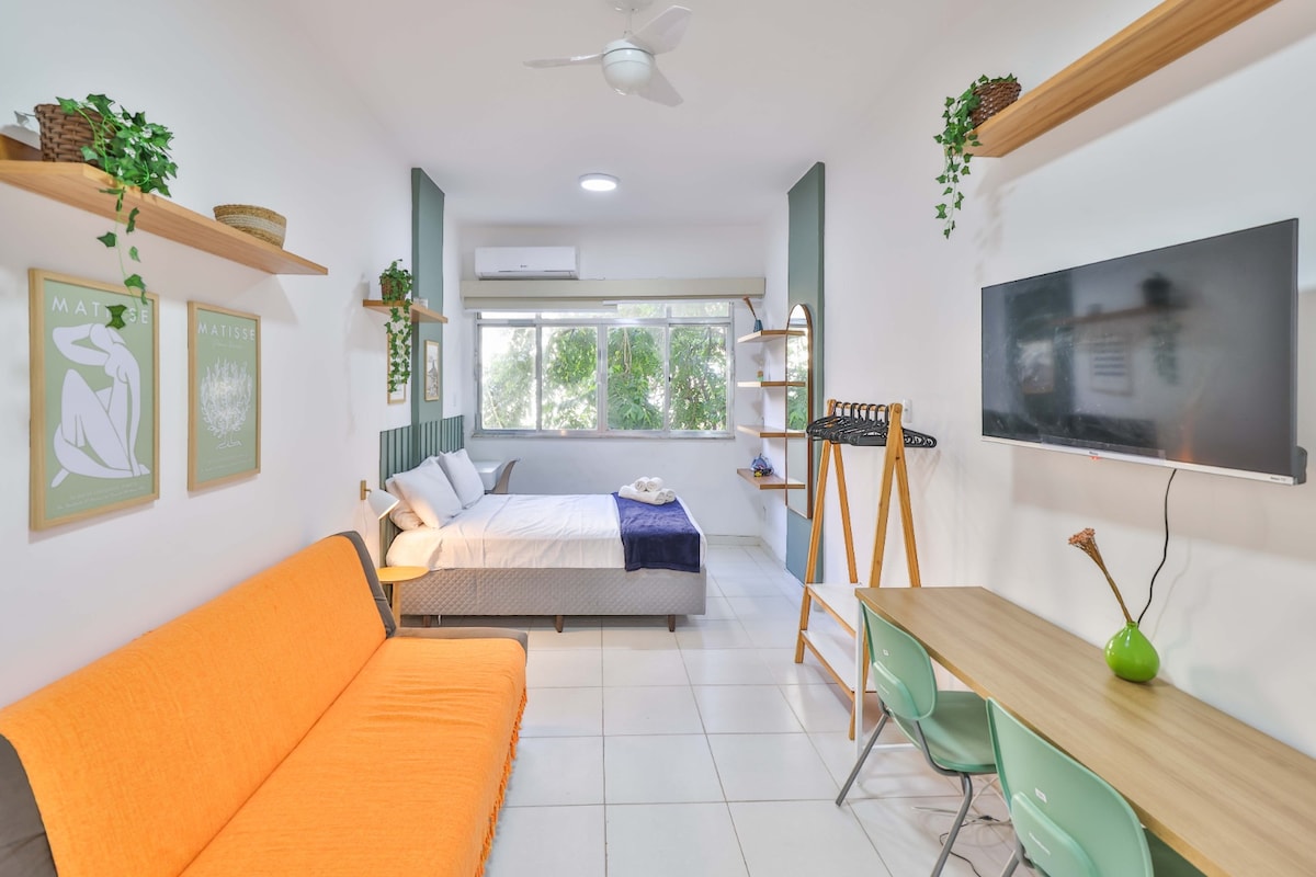 Kodikas yksiö puolen korttelin päässä Ipaneman rannalta. Rakennuksessa on 24 tunnin portinvartija, esteetön pääsy liikuntarajoitteisille, yhteinen alue, jossa on paljon viheralueita, ja pyöräteline. Huoneisto on varustettu mukavuuttasi ajatellen. Kylpy- ja rantapyyhkeet, 270 langan vuodevaatteet, pellavapeitto, ilmastointi 2 huoneessa (makuuhuone ja olohuone), minibaari, mikroaaltouuni, induktioliesi, Nespresso- ja perinteinen kahvinkeitin, 50" TV, Wi-Fi, kaapeli-TV, silitysrauta, hiustenkuivaaja, riippumatto.