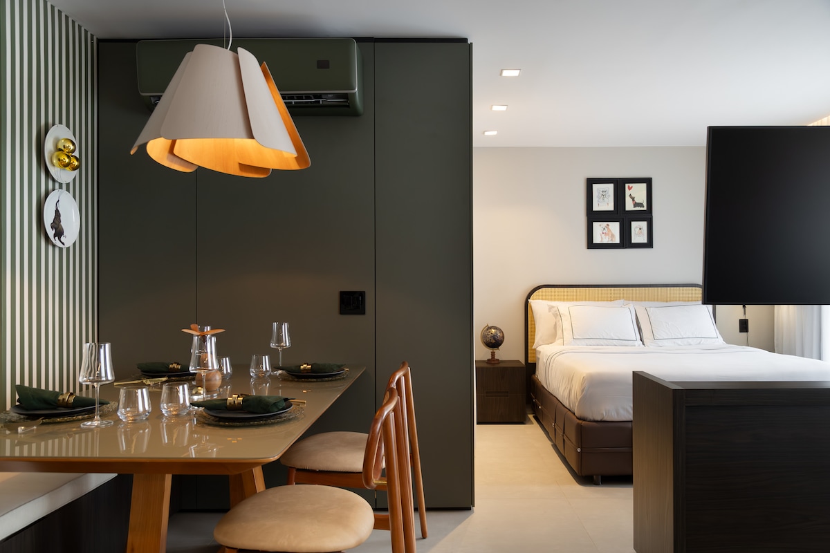 💯 Kauan eläköön Marista Premium -kokemus! Täydellinen huoneisto, jossa on erillinen makuuhuone ja olohuone, kaksi älytelevisiota, nopea wifiyhteys ja kaikki mukavuudet, joita tarvitset nauttiaksesi Goiâniasta tyylikkäästi. Täydellinen työ- tai vapaa-ajan matkoille. Kytke ilmastointi ja televisio päälle äänikomennolla ja kuuntele musiikkia Alexan kautta ja nauti Marista-alueen gastronomisesta keskuksesta ja nykyaikaisesta Bueno-alueesta Goiânian parhaalla alueella! Blend Smart Style Condominium Creation ®️Renovato -asunnot