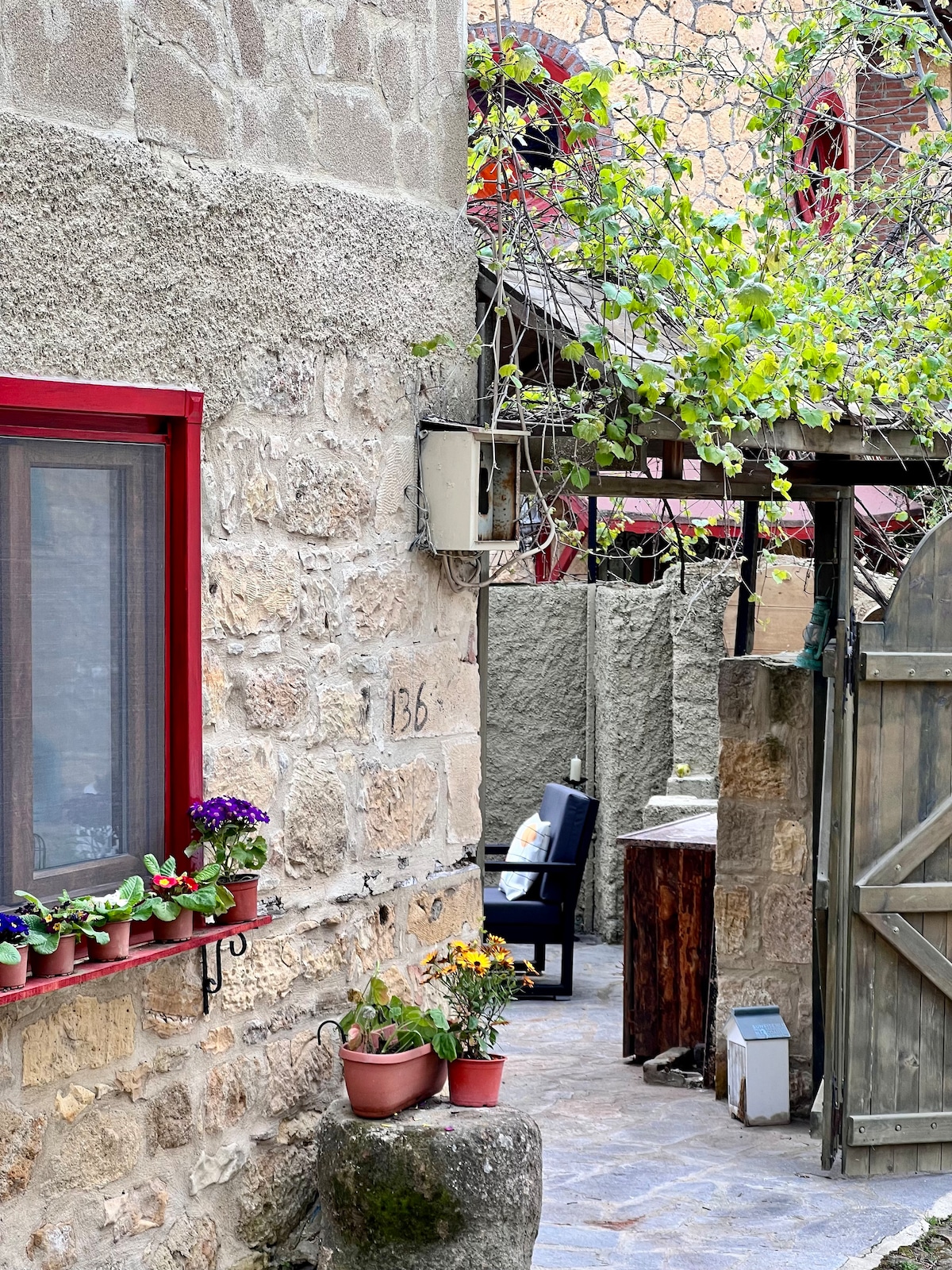 Historiallinen kivitalo sisäpihalla Adatepen kyläytävällä