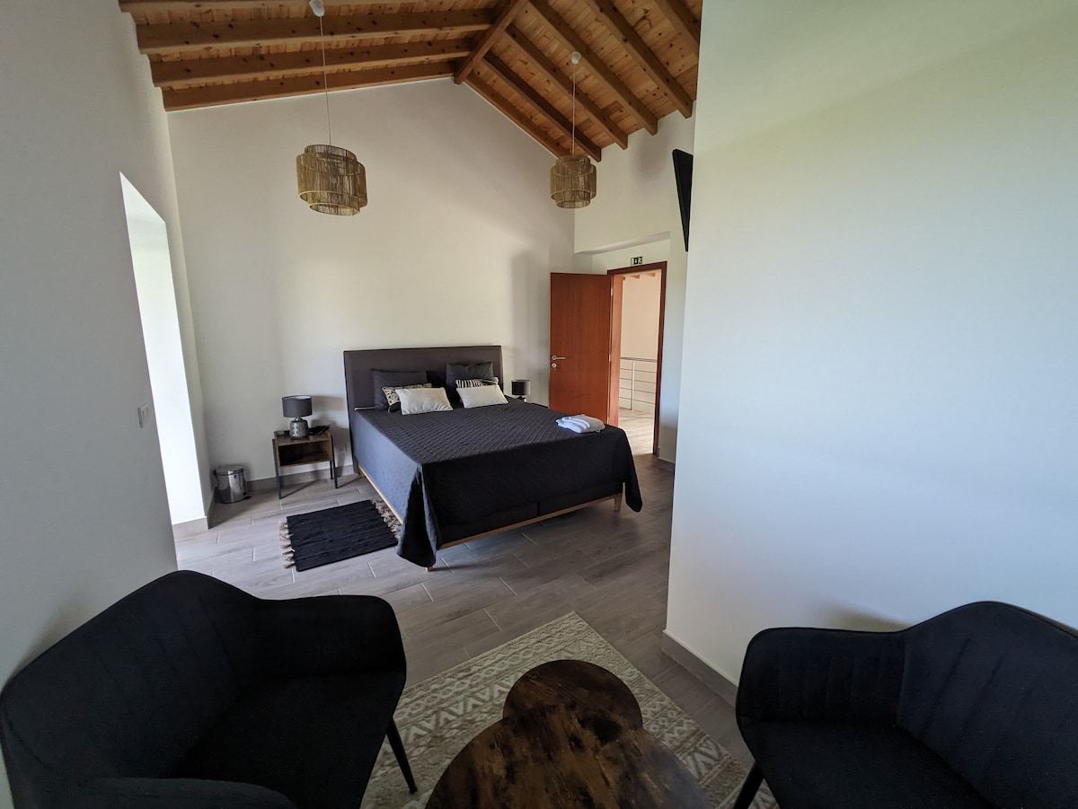 Did you know that volcanic basalt sand is black? The Black room is inspired by the basalt rocks and black sands of Faial. This superior room is located on the first floor, and its private terrace allows you to look out over the banana plantation, the ocean and Pico Mountain. The room is equipped with a queen size bed, TV, internet, air conditioning and a private bathroom with shower. If you're in a group, you can open up your terrace to that of your neighbours.