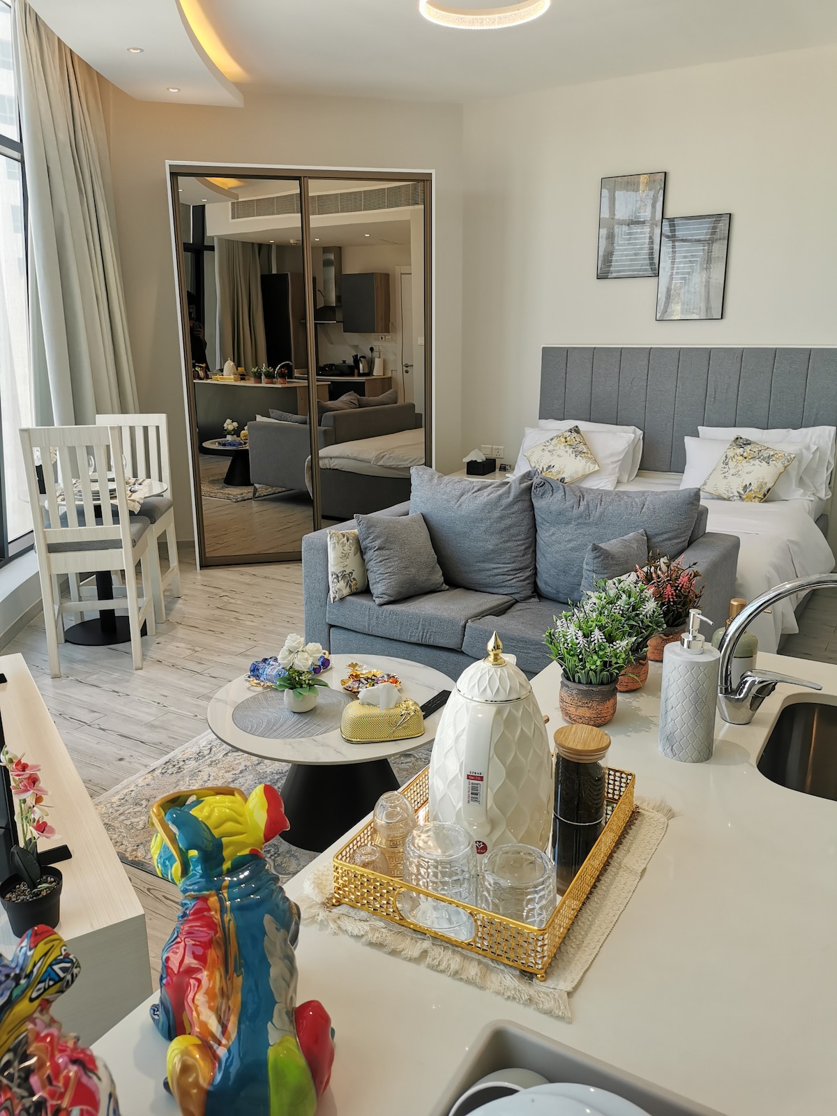 Ylellinen yksiö huippuluokan tornissa Seefissä. Huoneessa on queen-vuode, tyylikäs oma kylpyhuone, täysin varusteltu keittiö, pesukone, kahvikone ja kapselit, vedenkeitin ja teetä, ilmainen WiFi ja parveke, jolta on osittainen meri- ja kaupunkinäkymä. Mukavuudet: 2 ulkouima-allasta, sisäuima-allas, vain naisille tarkoitettu uima-allas, julkiset ja yksityiset kuntosalit, lasten leikkipaikka, kävelyreitti, grillausalue, pelihuone (biljardi ja PlayStation) ja pianohalli. Lähellä kaupungin keskustaa, Seef Mallia, Water Gardenia ja Saudi Causewayta.