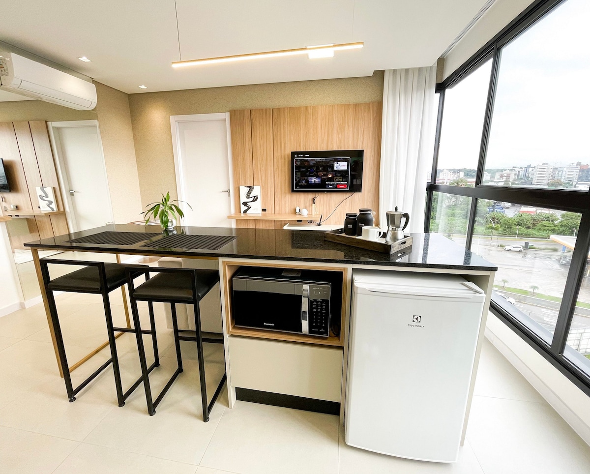 Apartamento de 40m, um quarto e uma vaga de garagem coberta. Hospede-se conosco e desfrute de uma vista incrível para a Serra e uma piscina na cobertura. O apartamento é novo, conta com móveis planejados e eletrodomésticos novos e modernos. Roupas de cama e toalhas das melhores marcas, limpeza impecável. Planejamos tudo pensando em hospedar você! O prédio está localizado na região central da cidade de Joinville, a 4min do Festival de Dança, 13min do Aeroporto, 8min até o Garten Shopping.
