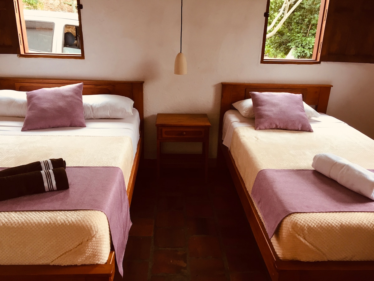 Romantic and cozy cabin surrounded by naturejust 4 km from Barichara. Ideal for a creative retreat. 100 m² with 1 bedroom, private bathroom with hot water, STARLINK conection, full kitchen and multiple open-air dining areas. Over 5,000 m² of natural grounds. Hotel restaurant 5 min walk. Accessible by car, mototaxi or bus.