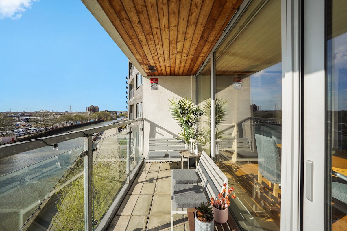 Ylellinen huoneisto Royal Docksissa (Lontoo, Newham), josta on mahtavat näkymät Thamesille, Royal Docksille, O2 Arenalle, Canary Wharfin ikoniseen horisonttiin, Canning Towniin ja Lontoon kaupunkiin 5 minuutin kävelymatkan päässä EXCEL LONDON 1 minuutin kävelymatka – IFS CLOUD CABLE Car Greenwich O2:een 5 minuutin kävelymatka Custom House -asemalle (Elizabeth-linja), jolta pääsee Lontoon keskustaan 8 minuutissa, Canary Wharfiin 4 minuutissa ja suorilla junilla Heathrow'n lentokentälle 1 minuutin kävelymatka Royal Victoria DLR -asemalle Kaupungin lentokenttä - 7 minuuttia Tietenkin koko Lontoo on helposti saavutettavissa