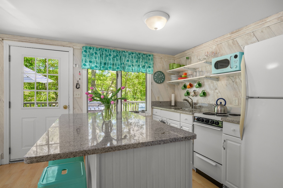 Pariskunnan/perheen hauskanpitoa ympäri vuoden viehättävässä yksityisessä Cape Cod -mökissä, jossa on kuisti, patio ja ulkosuihku (marras-/joulukuussa/tammikuussa tulee piparkakkumökki). Sisällä: avoin oleskelutila, jossa on queen-size-vuode ja oleskelutila. Tikkaat johtavat lyhyelle makuuparvelle, jossa on 2 erillistä vuodetta. Kylpyhuone, jossa on suihku. Keittotila - katso kuvaus alta. Toimitamme teetä, paikallista kahvia, mausteita, mausteita, kaasugrilliä, jääarkkuja, rantapyyhkeitä ja -tuoleja. Jos haluat nukkua jopa 8, vuokraa myös ylemmän huoneemme Airbnb: llä.
