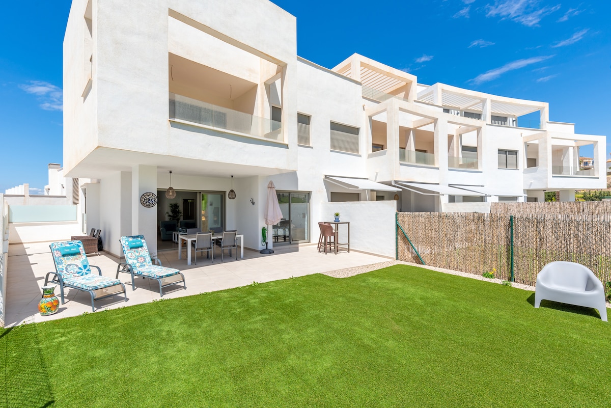 Valoisa pohjakerroksen huoneisto, jossa on suuri yksityinen aurinkoterassi sekä suora pääsy puutarhoihin ja yhteiselle uima-altaalle. Ihanteellinen perheille: 3 makuuhuonetta, 2 kylpyhuonetta, tilava olo- ja ruokailuhuone, täysin varustettu keittiö, ilmastointi, lämmitys ja 500 Mbit/s:n valokuitu-WiFi. Nauti auringosta aurinkotuoleilla, ulkona syömisestä ja rentouttavista hetkistä oleskelutilassa. Hiljainen asuinkortteli Baviera Golfin alueella, jossa on kesäuima-allas, padeltenniskenttä ja yksityinen pysäköintialue. Lähellä rantaa ja Caleta de Vélezin venesatamaa.