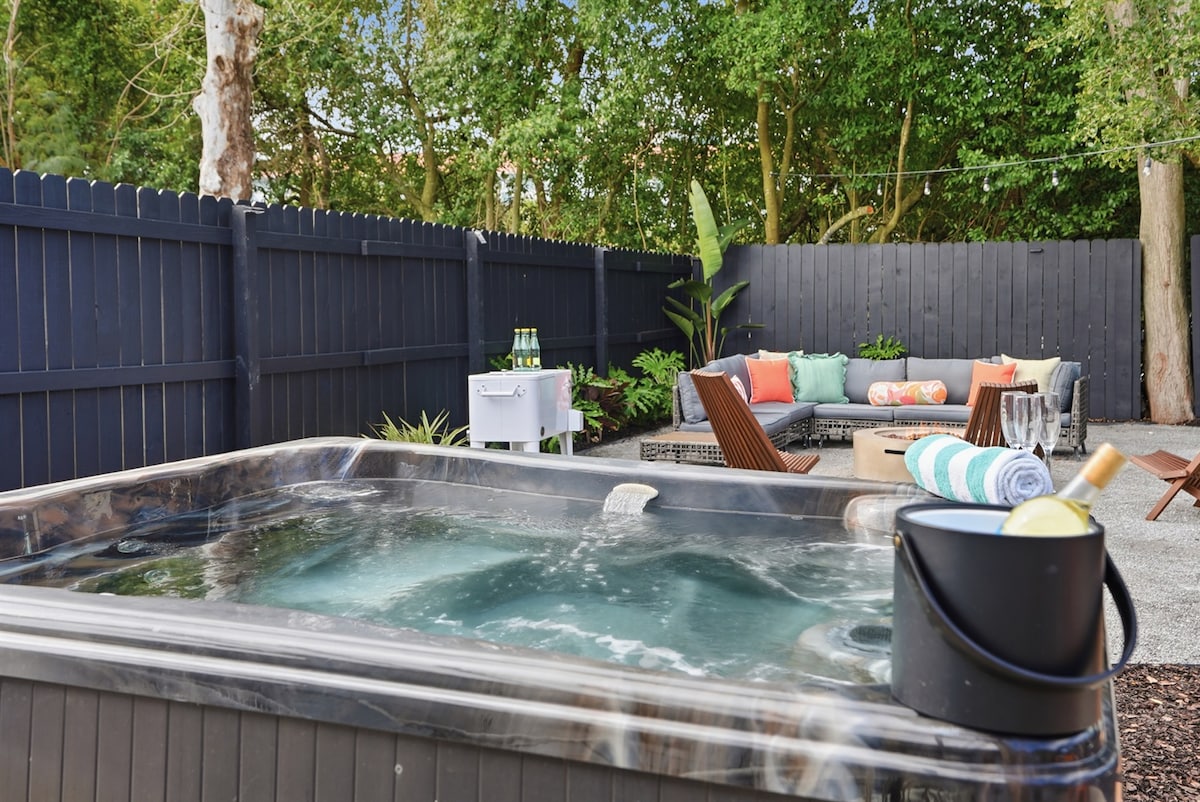 Lämmitetty uima-allas, kävelymatka rannalle, poreallas, nuotiopaikka ja elokuva