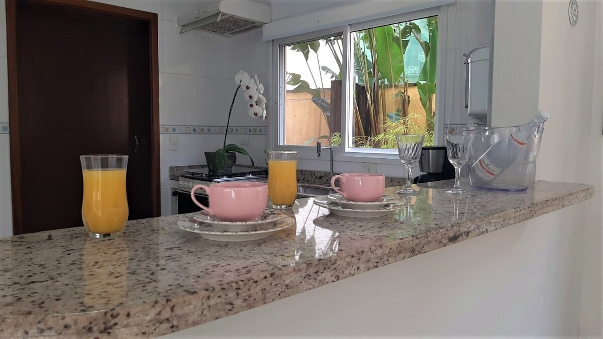 Casa ampla para até 20 pessoas, pensada para convivência e encontros de grandes grupos. Quiosque completo com churrasqueira, fogão à lenha e estrutura para refeições ao ar livre. Sala de jantar para 20 pessoas e living com TV, bar e mesa de carteado, tudo com ar-condicionado. Wi-Fi. Cozinha completa com 3 geladeiras e ar-condicionado. 6 suítes (1 no térreo), todas com ar-condicionado, TV e ventilador. Totalmente equipada com utensílios de cozinha, roupas de cama e banho. A 200 metros da praia.