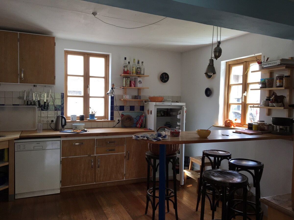 Asumme maaseudulla, jossa on paljon viheriötä, raitista ilmaa ja vapautta, ja olemme avoimia vieraille. Perinteisesti kalustettu leipomotalo, jossa on puuhella, makuuparvi ja täysin ajaton mukavuus, sijaitsee erillään tontilla. Asuinrakennuksen vieressä (40 m päässä) on moderni kylpylä, joka on vieraidemme yksityisessä käytössä. Meillä kotona luetaan paljon, filosofoidaan, juodaan hyvää viiniä ja huolehditaan elämän perusasioista, puhtaasti minimalistisesti! Seikkailu ylellisyyden sijaan.