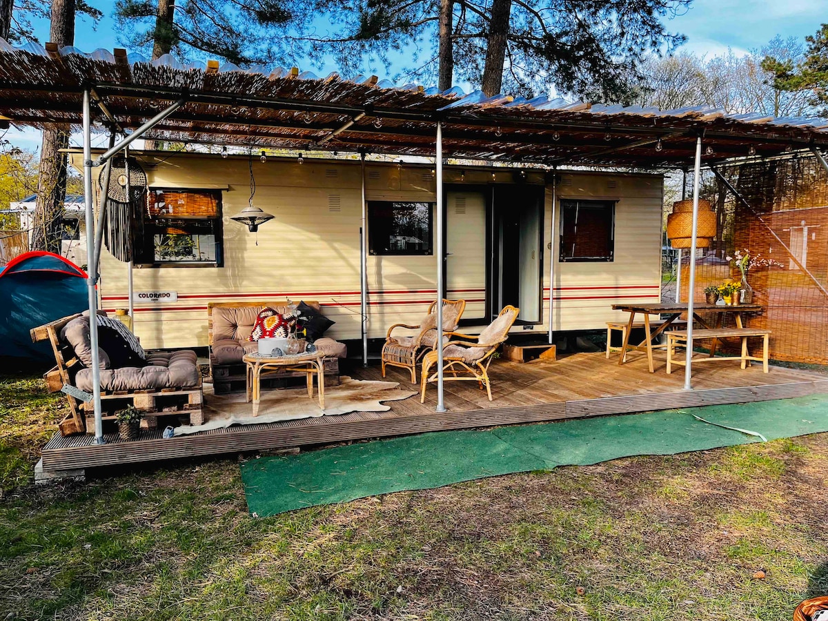 Tässä kodikkaassa, suuressa, ainutlaatuisessa asuntovaunussa luonnon ystävä tuntee olonsa kotoisaksi. Yksityinen puutarha, jota ympäröivät hiljaiset niityt, metsä ja heath. Puuhella on erittäin mukava kylminä päivinä, sinun täytyy pystyä polttamaan! Asuntovaunu on 70 vuotta vanha, ja siellä on vielä monia aitoja elementtejä. Huomaathan, että asuntovaunu ei ole eristetty, se on erittäin lämmin kuumina päivinä, mutta sitten olet ulkona, ja siellä on paljon varjoa. Se myös jäähtyy nopeasti. Makuuhuoneessa on näytöt ja hyttysverkot.