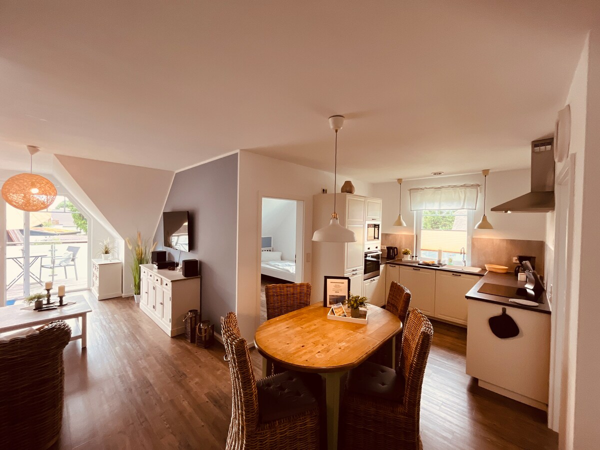 Asut kauniissa, maalaistyylissä sisustetussa kapteenin talossa Wieckissä/Darßissa. Olkatulla katolla katettu noin 65 neliömetrin asunto tarjoaa kaksi makuuhuonetta, joissa on parisänky tai parivuodesohva, kylpyhuone suihkulla ja wc:llä sekä avoin oleskelutila, jossa on keittiö ja ruokailutila. Keittiössä on astianpesukone, mikroaaltouuni, jääkaappi ja kahvinkeitin. Olohuoneessa on satelliittitelevisio. Langaton internet on saatavilla koko asunnossa.