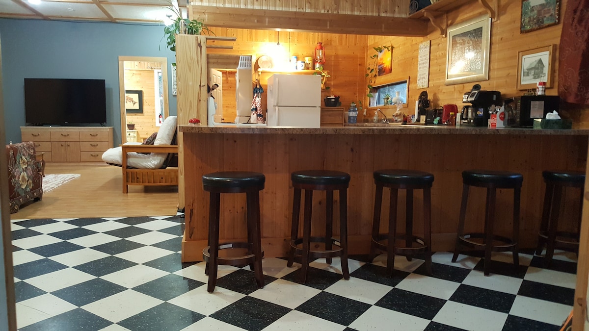 Yksityinen ja rauhallinen. Golfkenttä naapurissa Mins to Shopping & food 420 friendly with cozy deck. Tarjolla on 4 vuodetta, 2 makuuhuonetta. Avoin konsepti retro mökki tyyli mökki vieraillemme etsimään sitä kotia maaseudulla. Täysin varustettu keittiö, 1000 neliöjalkaa Valoisa ,iloinen ja ainutlaatuinen ilmapiiri. Ystävälliset lemmikkieläimet ovat tervetulleita lemmikkiystävälliseen ympäristöömme ja pihallemme. Dragon lake Fishing vain muutaman minuutin päässä! Pyykinpesu- ja Concierge-palvelu pyynnöstä *lisämaksuja saatetaan periä