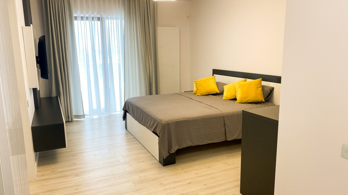 Nest Pitești 1, moderni ja viihtyisä 2 huoneen huoneisto. 4 vierasta: 1 tyylikäs makuuhuone ja olohuone, jossa on vuodesohva. Täysin varustettu keittiö, jossa on astianpesukone, kahvinkeitin ja kaikki välttämättömyystarvikkeet. Älytelevisio, jossa Netflix, YouTube, Prime ja paljon muuta. Nopea wifi, ilmastointi, keskuslämmitys. Yksityinen pysäköinti rakennuksen edessä, pääsy hissillä. Kylpylä ja uima-allas alakerrassa. 2,5 km kaupungin keskustasta 4,5 km A1-moottoritielle 200–300 m Lidl-, Penny- ja Profi-ketjuihin 1,5 km Trivale-metsään Itsepalvelusisään-/-uloskirjautuminen