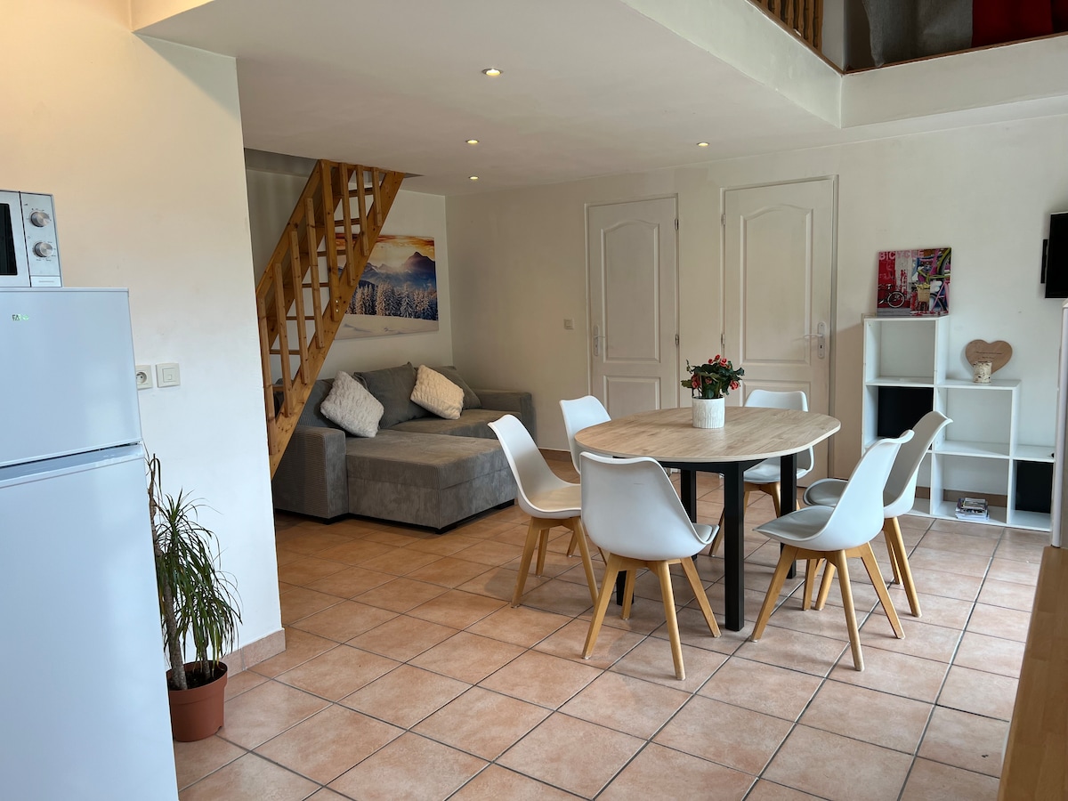 2 huoneen huoneisto hiljaisessa paikassa pohjakerroksessa. 10 minuuttia Aix les Bainsista ja 30 minuuttia Annecystä, lähellä Semnozin, Féclazin ja Revardin hiihtokeskuksia, jotka ovat 30 minuutin päässä. Se on täysin kunnostettu. Yksi makuuhuone, jossa on 140 x 200 cm:n vuode ja lasten kerrossänky, olohuone, jossa on keittiö ja vuodesohva, sekä kylpyhuone, jossa on suihku ja erillinen wc. Jääkaappi, uuni, mikroaaltouuni, keraamiset keittolevyt, Dolce Gusto -kahvinkeitin, astianpesukone, TV, raclette-grilli, vedenkeitin, leivänpaahdin, ulkosalonki erittäin rauhallisella jaetulla alueella.