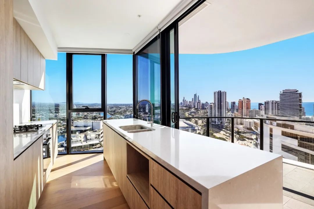 Keskimääräinen arvio 4,85/5, 91 arvostelua2 makuuhuonetta Broadbeach huoneisto 180° horisonttinäkymä 90 neliömetriä