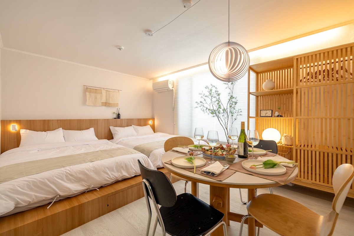 Tervetuloa Dongdaemuniin, Soulin sydämeen, jossa kaupunki loistaa kirkkaammin yöllä. Toisin kuin ulkona olevat vilkkaat kadut, kohteemme tarjoaa rauhallisen, kodikkaan majoituksen lämpimillä puusävyillä ja pehmeällä valaistuksella – täydellinen paikka rentoutua pitkän päivän jälkeen. – 10–15 minuutin kävelymatka DDP- ja Doota-ostoskeskuksiin – 5–10 minuutin kävelymatka Dongdaemun History & Culture Park -aseman (linjat 2, 4, 5) uloskäynnistä 6 (tai uloskäynnistä 4, jos käyt hissiä) – Lentokentältä: ota bussi 6001 Baiton Hotel -pysäkille (2–5 minuutin kävelymatka)