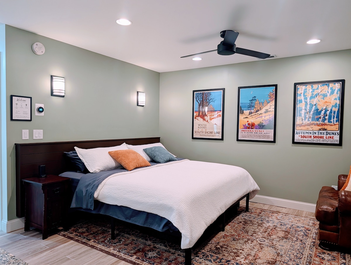 Vaulted skylights allow natural light. Ksize bed. Couch opens into a full size bed. (DEEP cleaned to AirBnb COVID-19 disinfectant standards) Fully stocked kitchen, sm. bathroom w/ shower. Parking ft. of house, 1.5 M from Lake Michigan Shoreline, 2 blocks to 15th St. entry to Prairie-Dune Trail. European Market (May -Oct) each Saturday downtown. Fall season drives along U.S. HW 12 & 20 for foliage Winter day hikes, x-county skis trail, shopping trips to the Michigan City Outlet mall.
