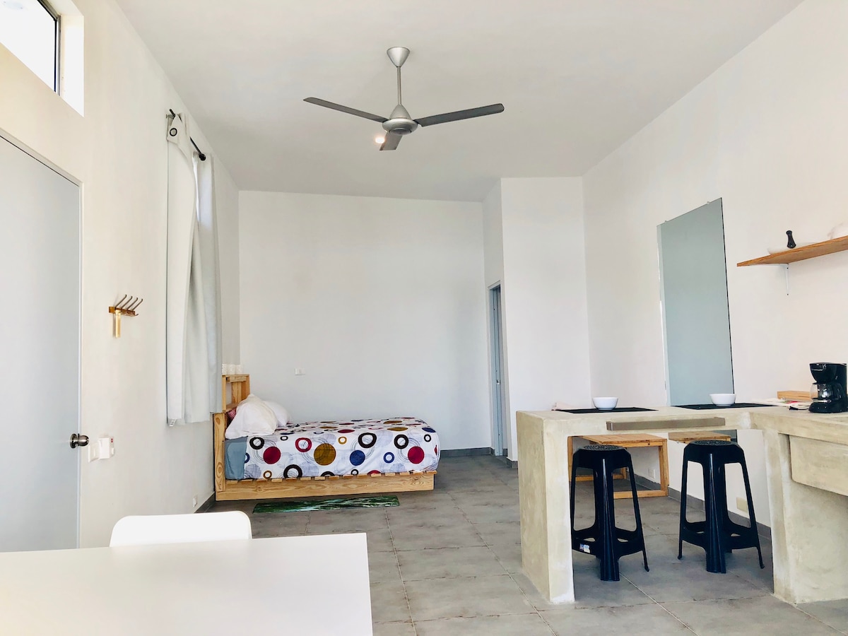 In the center of Cabarete and just 2 minutes walking distance to the beach. We offer you a simple and comfortable little loft with living/dining/kitchen and mezzanine with bed and desk. Perfect for people who like water sports or work remote, for single or couples.
