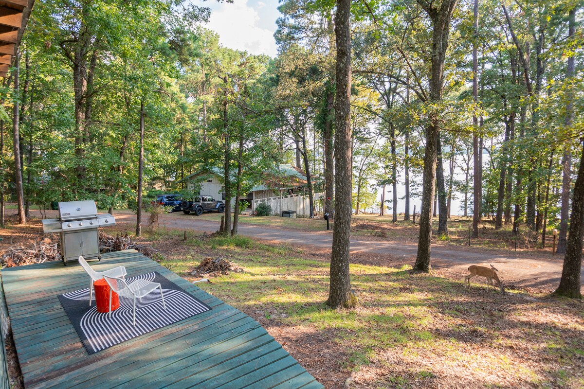 Tule rentoutumaan, irtiottoon ja nauttimaan luonnosta. Nauti upeasta näkymästämme Lake O' the Pines -järvelle tästä tyylikkäästä mökistä, joka on kukkulalla. Kaksikerroksinen kuisti, jolta on näkymät järvelle, metsille, auringonlaskuille ja villieläimille, on täydellinen paikka rentoutua. Lähellä Jefferson Tx:ää ja Caddo Lakea. *lue ilmoitus kokonaan ennen varaamista* Ei wifiä eikä mikroaaltouunia. Vain vieraat, jotka kunnioittavat rakasta kotiani. Ei pääsyä järvelle.