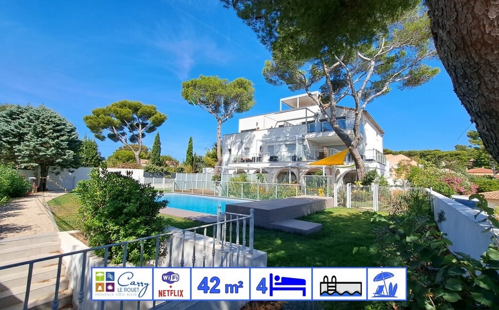 Situé au centre ville de Carry-le-Rouet et à 100 mètres du port. L’appartement est de plain-pied d’architecture Contemporaine, chaleureux et totalement indépendant. Il se trouve dans une rue calme avec très peu de passage. Il y a un jardin de 60m2, indépendant exposé sud-ouest , l’été vous serez accompagné par le chant des cigales avec Transats et parasol qui vous feront passez d’agréables moments de détente. Place de parking. Terrasse. Nous proposons des sorties en bateau. Fibre