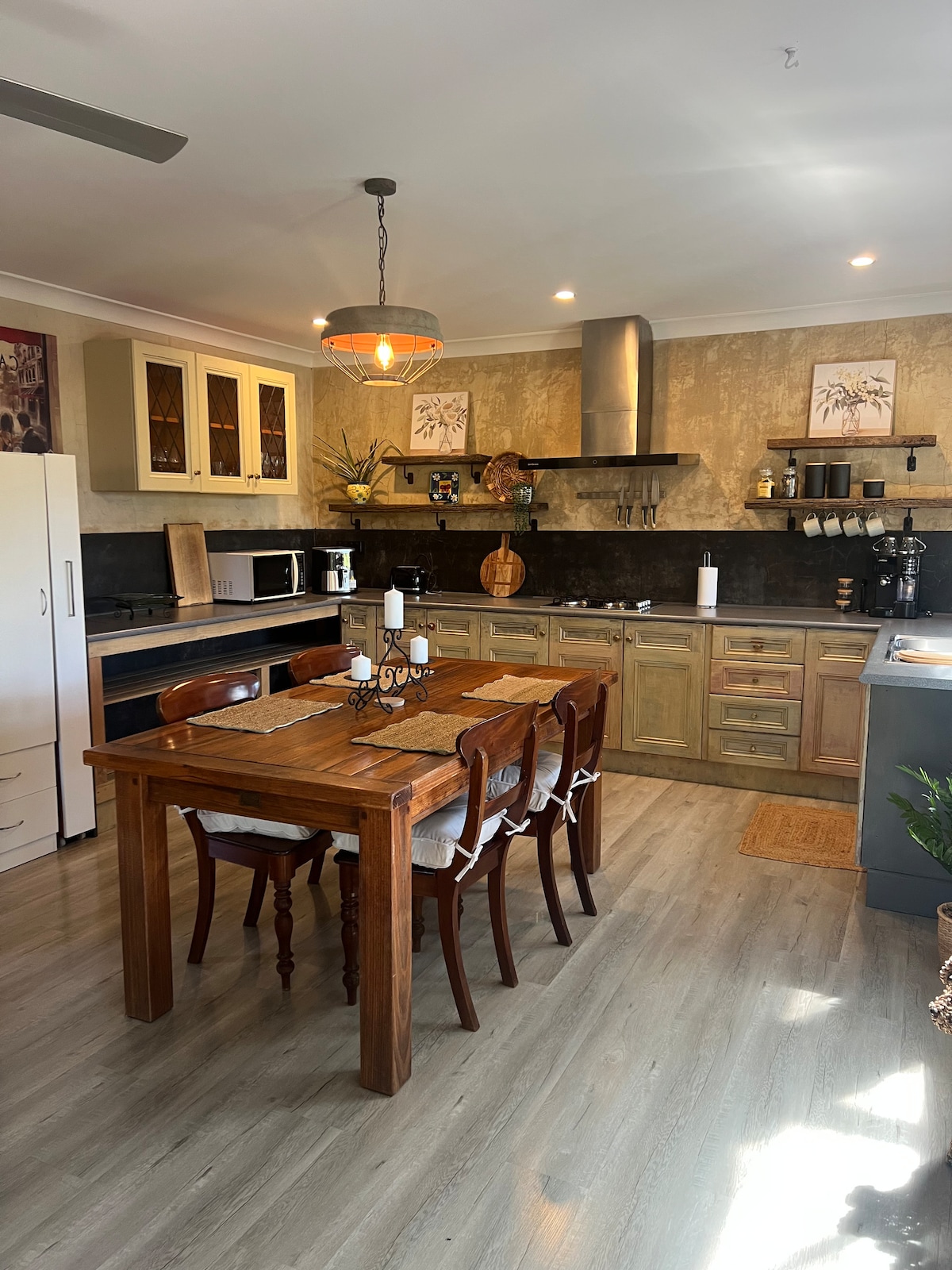 Air bnb for 2 in the heart of Loch Village Originally a gallery, Space On The Hill is a large free standing, open plan warehouse style space. It is in the heart of town, has views over rolling green hills and is 200 meters from the Great Southern Rail Trail. • 1 x queen bed • 1 x bathroom, walk in shower • Full kitchen • 2 x tables (dine/work) • Lounge space with 2 sofas • Separate comfy sofa bed • Super warm, huge split system heating / air con • Village bustling by day, serene by night