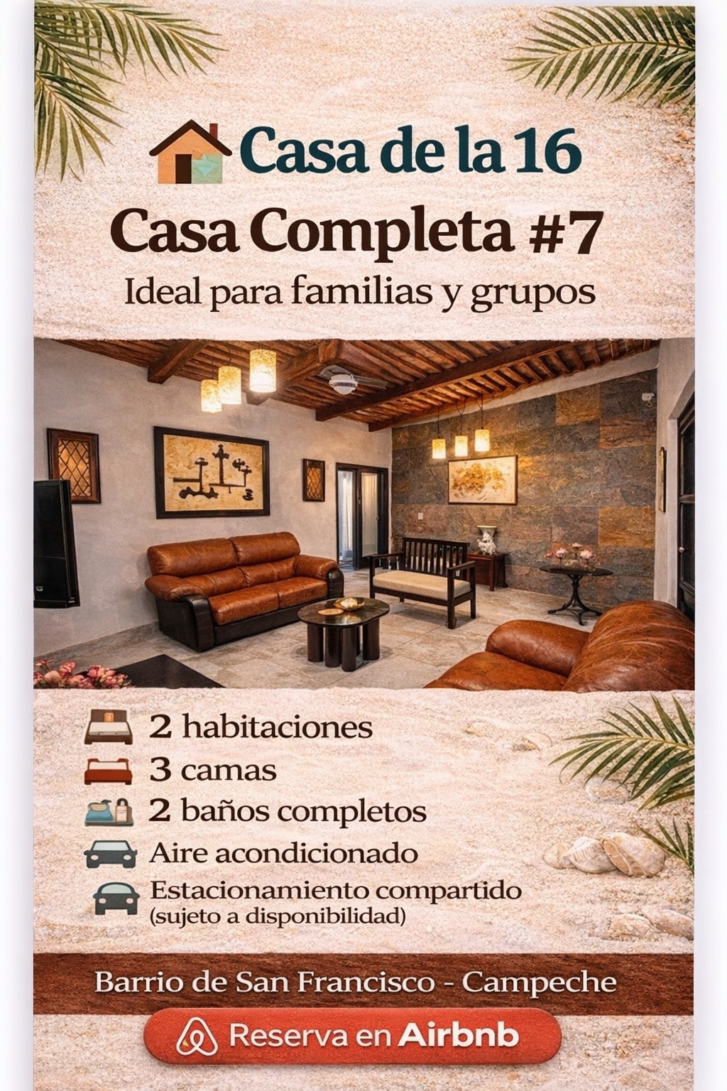 Nauti tämän majoituksen yksinkertaisuudesta yhdessä kaupungin vanhimmista kaupunginosista. Se on rauhallinen, tilava ja perheystävällinen tila muutaman metrin päässä historiallisesta keskustasta, jossa voit löytää kahviloita, ravintoloita, baareja, kauppoja ja matkamuistoja Campechan käsityöläisiltä kuuluisalla Calle 59:llä. Talossa on autotalli, sängyt, vauvansänky, ilmastointi molemmissa huoneissa, kattotuulettimet, riippumatot, varusteltu keitti, lämmitin, internet ja kaapeli-TV. Lähtöaika on klo 12.00 ja saapumisaika klo 15.00.