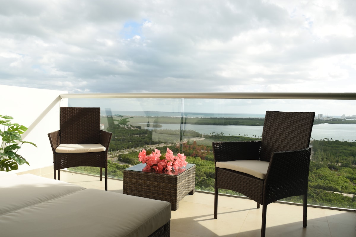 Departamento en piso alto con terraza privada y vista abierta al mar y la laguna. Desde la terraza se disfruta una perspectiva amplia y luminosa, con sensación de altura, espacio y calma, ideal para sentarse, desayunar o simplemente contemplar el paisaje. Ubicado en el área de Malecón Tajamar, en el corazón de Cancún, con acceso rápido a supermercados, restaurantes y vialidades principales, combinando una ubicación urbana estratégica con una vista privilegiada desde la altura.