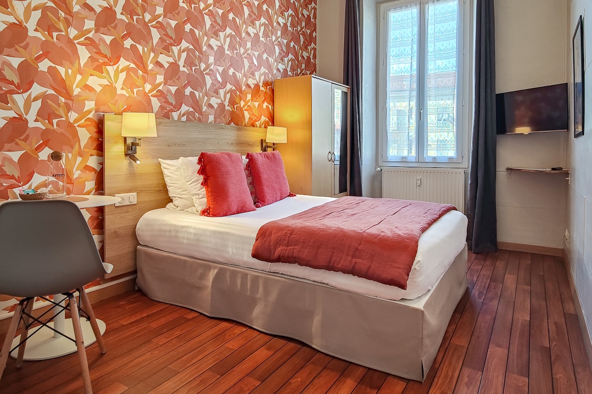 La chambre est dotée d'une salle de bain privative, d'un bureau et d'une télévision à écran plat. Elle est prévue pour accueillir jusqu'à deux personnes maximums. Toutes les chambres donnent côté rue. La salle de bain a été refaite récemment et la literie est de haut standing pour assurer un maximum de confort.