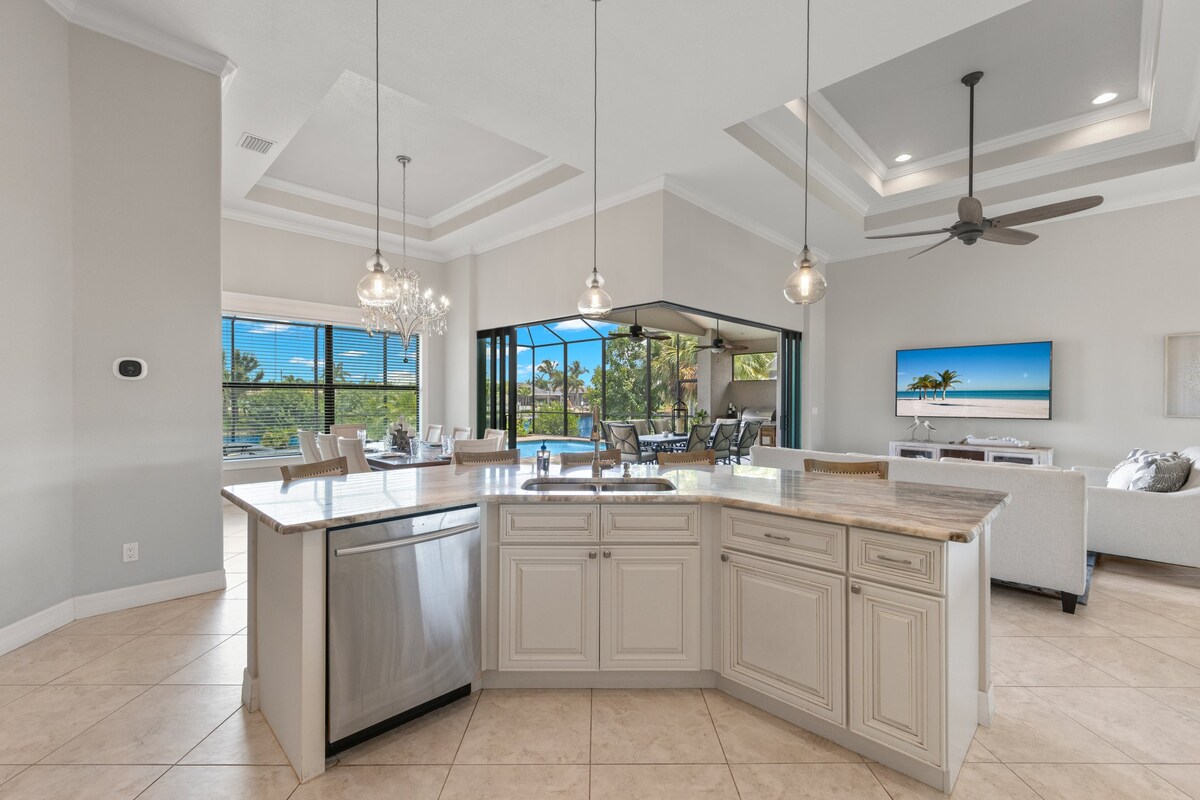 The sunshine state is calling, and luxe living awaits at this modern and spacious Cape Coral home. Tuo perheesi tähän 4 makuuhuoneen 3 kylpyhuoneen taloon ja nauti sen runsaista mukavuuksista. Tässä kohteessa on täysin varustettu keittiö, älytelevisio kaikissa huoneissa ja sähkötakka. Rentoudu koko päivän yksityisellä patiolla tai hyppää uima-altaaseen, jos haluat rentoutua. Kokeile paikallisia ruokapaikkoja aivan kadun varrella, harjoita rusketustasi rannalla tai nauti ruoanlaitosta grillissä. Seuraava lomakohteesi odottaa!