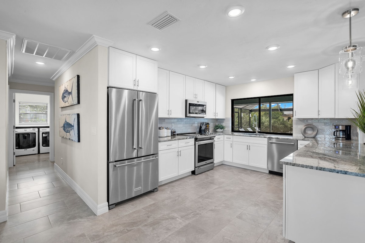 Pitäkää hauskaa koko perheen kesken tässä tyylikkäässä Naples Costal Paradise Home -kohteessa. Trooppinen keidas muutaman minuutin päässä rannoista, ravintoloista, ostoksista ja viihteestä. Lämmitetty uima-allas/kylpylä ilman suihkusuuttimia, WiFi, iso lanai grillillä ja paljon muuta. Talo on 3 makuuhuonetta, 2 kylpyhuonetta, täysin kunnostettu rannikon nykyaikaisessa tyylissä, jossa on laattalattiat, rannikon taidetta, suuri keittiö ja paljon muuta. King-size-vuode, queen-size-vuode, 2 kokonaista vuodetta, iso moduulisohva. Taloon mahtuu mukavasti 6 aikuista ja lapsia. Siellä on kaikki mitä tarvitset upeaan lomaan.