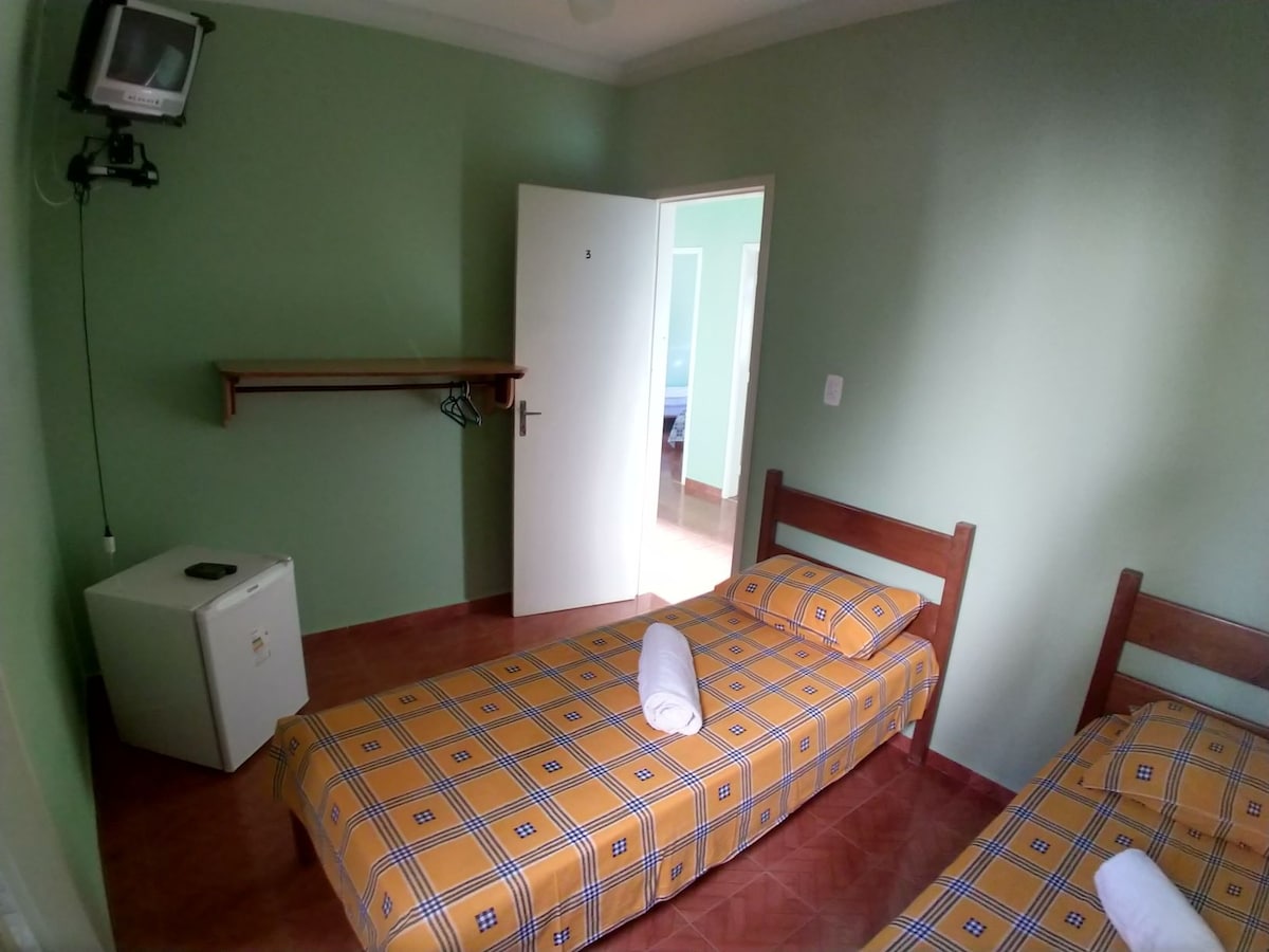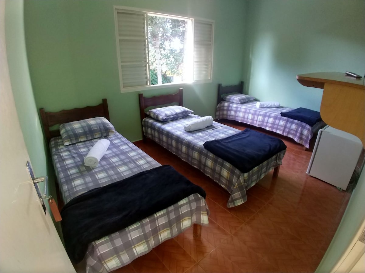 Quarto amplo equipado com 3 camas de solteiro, oferecendo uma linda vista para as serras de Carrancas. O espaço está equipado com TV, frigobar e ventilador.