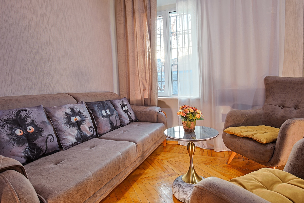 Pitäkää hauskaa koko perheen kesken tässä tyylikkäässä kohteessa. Huoneisto sisältää kaikki tarvittavat asuinrakenteet ja ruokailuvälineet. Sijaitsee täydellisessä paikassa. Markkinat ovat lähellä kohdetta, ja voit ostaa kaikenlaisia tuotteita. Katu on hiljainen ja viihtyisä. Rakennuksen ensimmäisessä kerroksessa sijaitsee ammattimainen pesula "Lavanda" Huoneisto on kolmannessa kerroksessa.