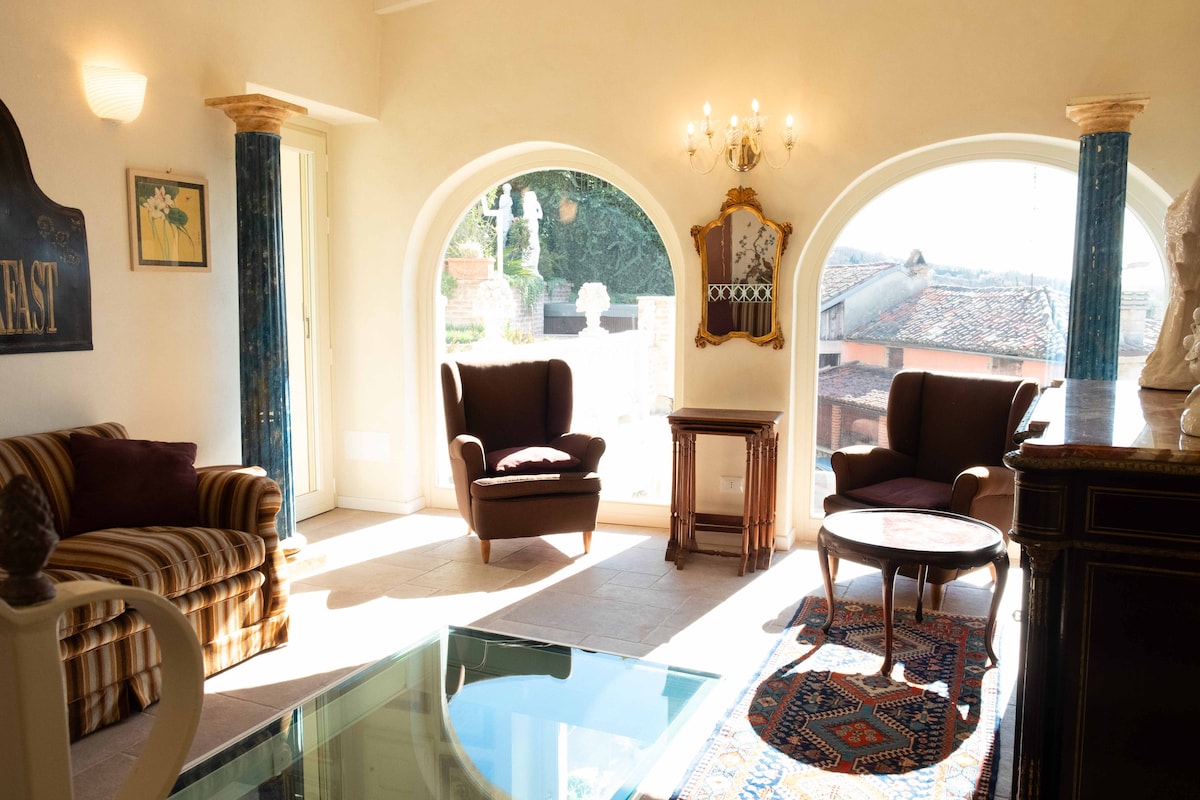 Pieni, yksinkertainen tornitalo vuodelta 1826 osana entistä viinitilaa vuodelta 1750. Tilava terassi, jolta on näkymät maaseudun Monferraton kumpuileville kukkuloille keskellä Unescon maailmanperintökohdetta. Talo on pieni, yksinkertainen, mutta aito ja sijaitsee hiljaisella kadulla. Aivan vieressä on kaunis uusgoottilainen San Martinon kirkko. Täydellinen tukikohta kävelyille ja patikoinnille suoraan talosta. Erittäin hyviä ravintoloita ja viinibaareja alueella.