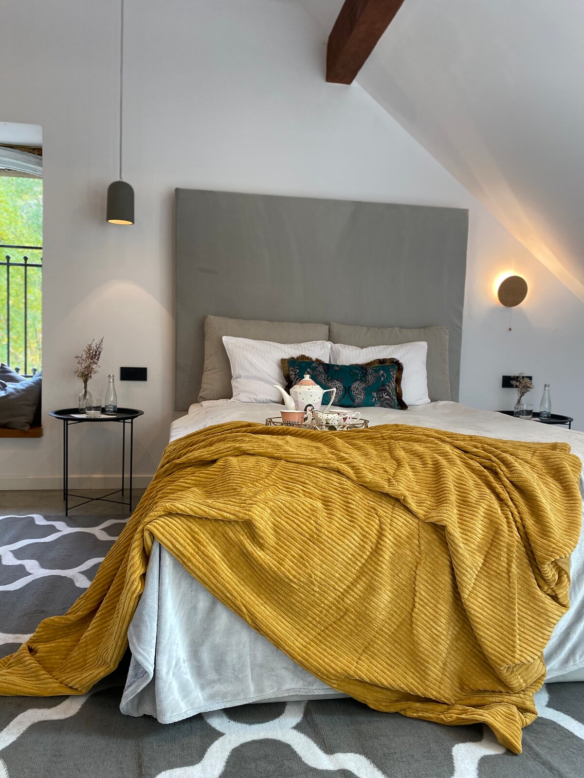 Komfortowy parterowy dom (35mkw) z prywatnym zadaszonym tarasem z ogrzewaniem (15mkw). W pełni wyposażona kuchnia, kontynetalnye łóżko Queen Size z warstwą Memory Foam, ponadwymiarowy prysznic XXL z deszczownicą. Prywatna wanna z hydromasażem na świeżym powietrzu. Czynne w zimie przy temperaturze powyżej -3st Celsjusza. Budynek otoczony prywatnym półdzikim ogrodem przechodzącym płynnie w nadrzeczne łąki. W części wspólnej ogrodu hamaki, grill węglowy, miejsce na ognisko, meble ogrodowe.
