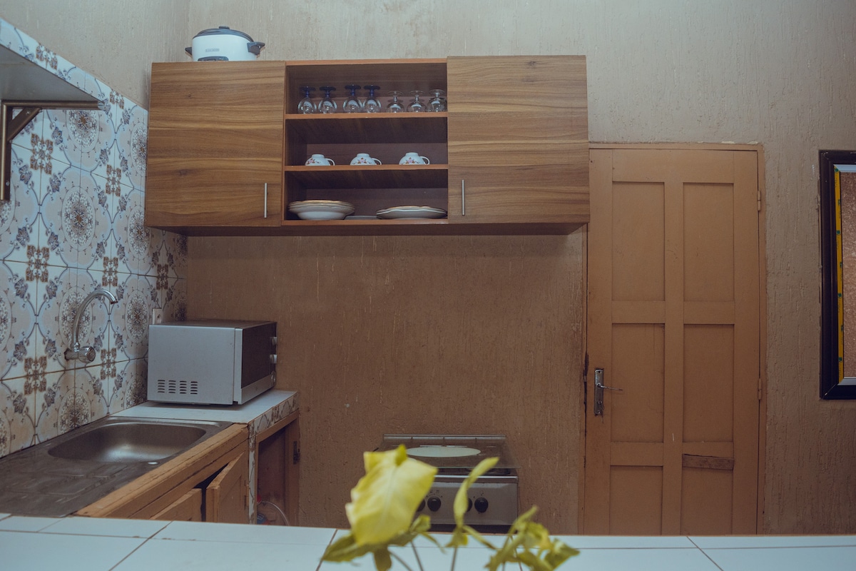 Yksi pala resursseja! Tule tutustumaan afrikkalaiseen kulttuuriin. Majoitamme sinut mielellämme kodeissamme. Käytössäsi on tyypillinen suihku. Ja tyypillinen keittiö myös. Kuiva wc. Puiden ympäröimä talo älä epäröi ottaa kiikareita katsomaan lintuja...